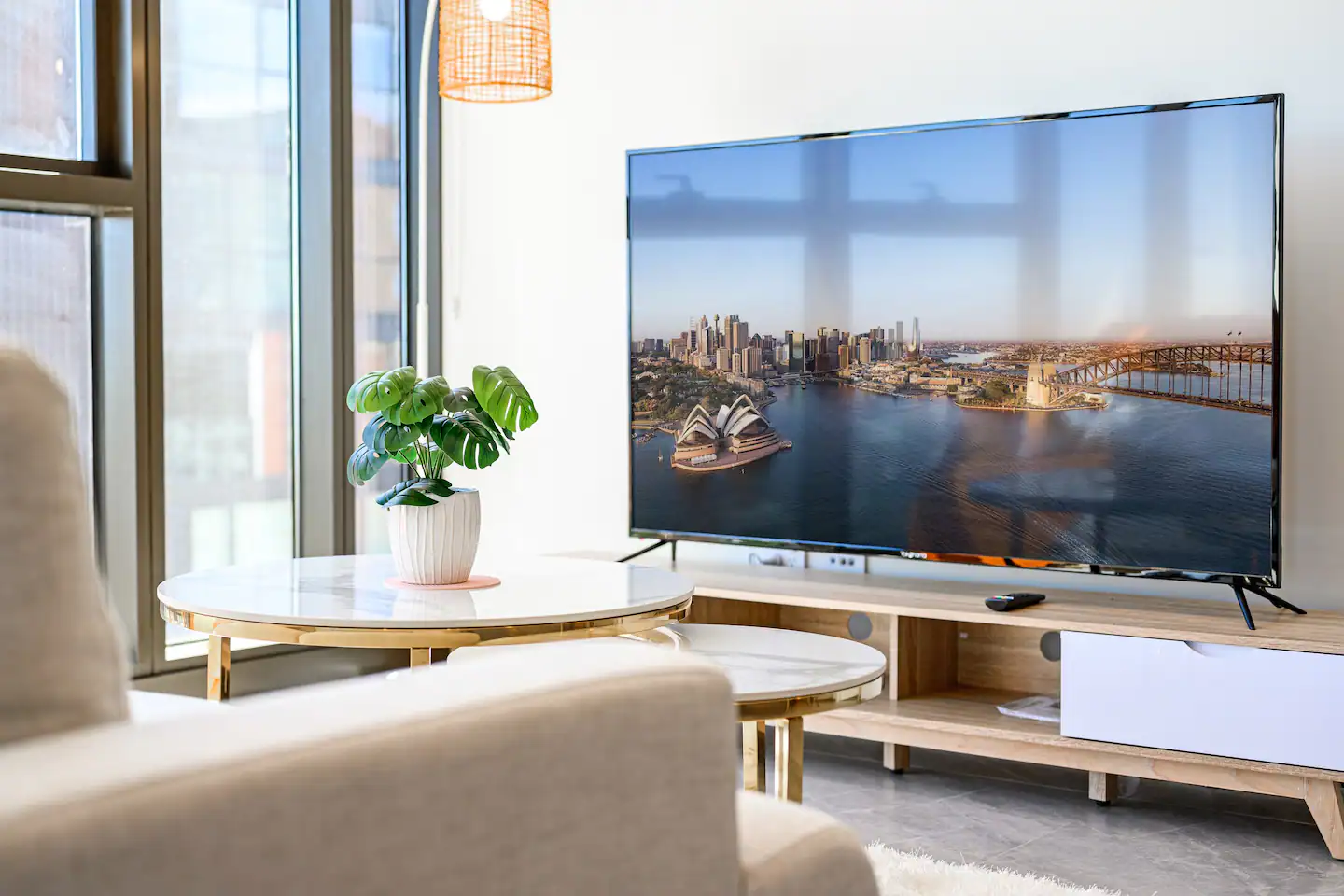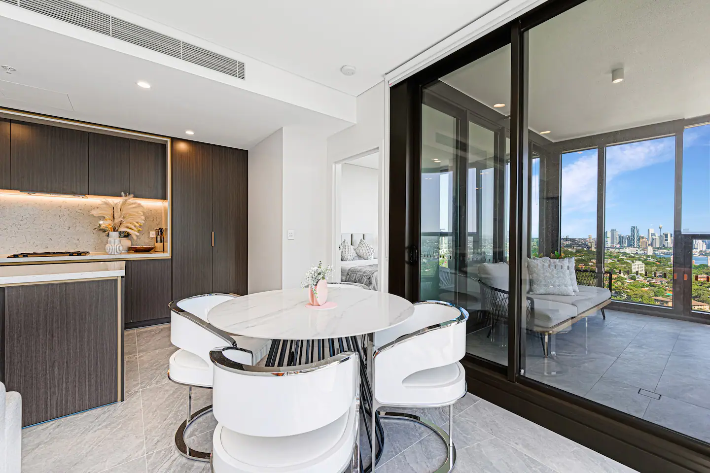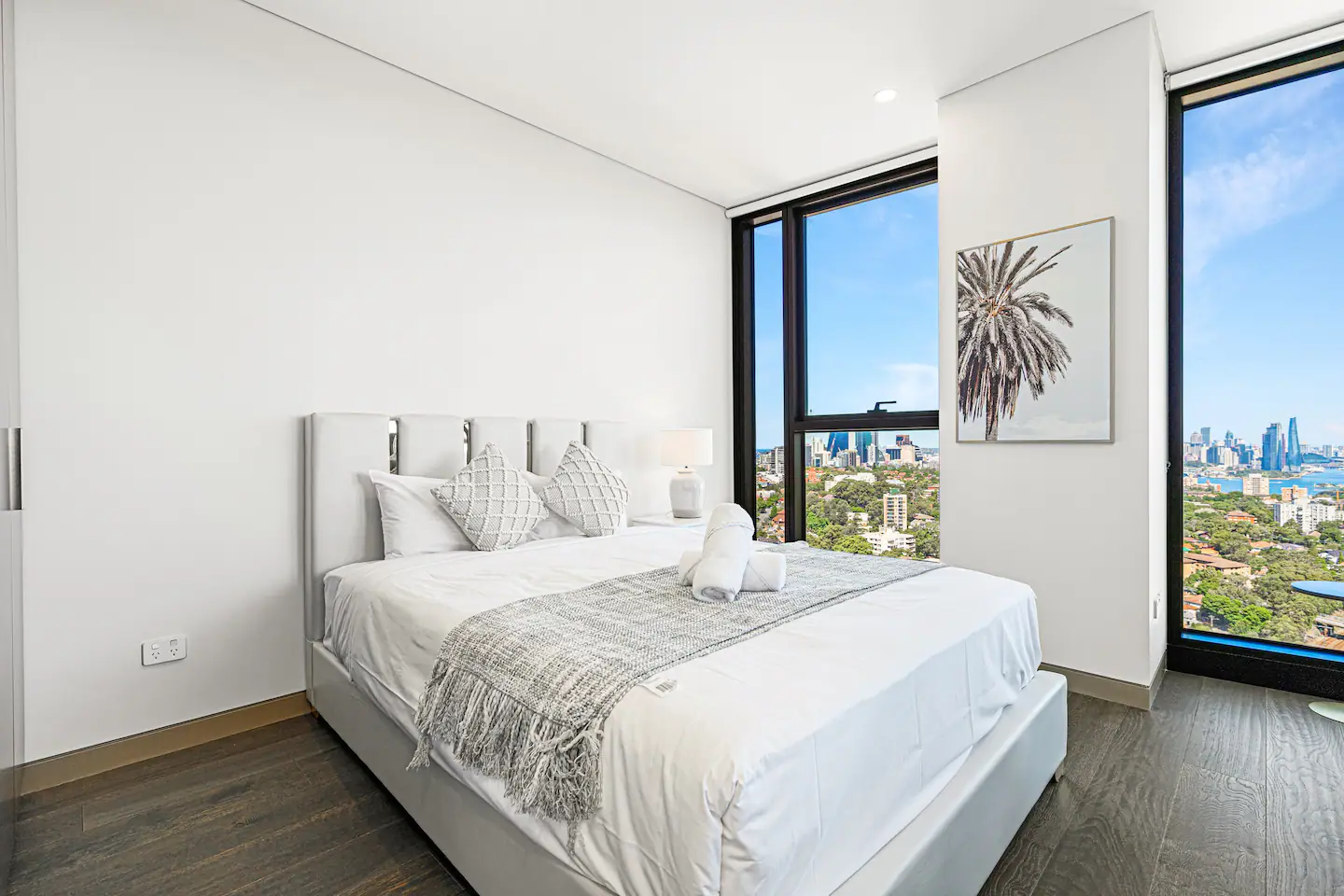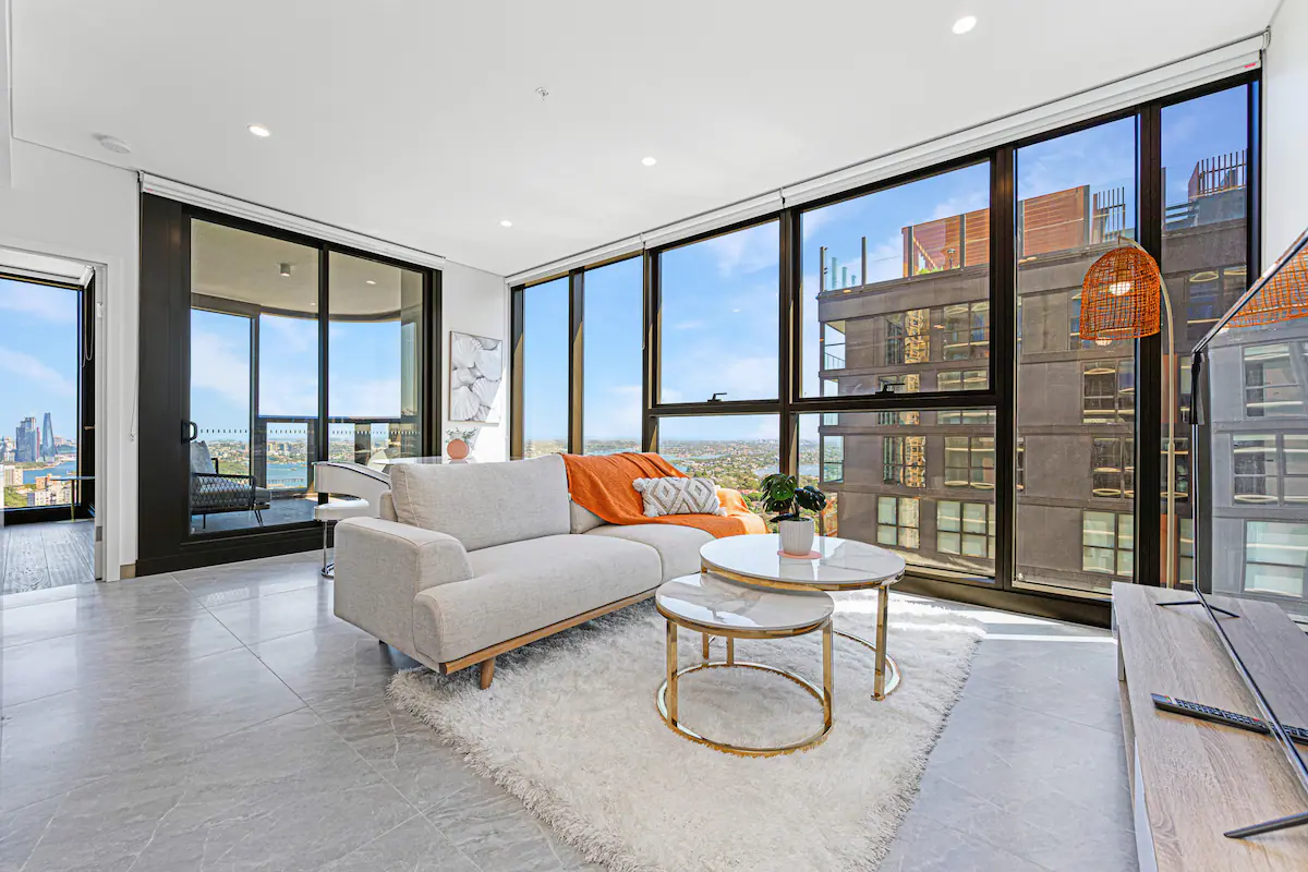The apartment features floor-to-ceiling windows and large balcony that offer breathtaking views of the city skyline and Sydney Harbour Bridge. The living room is cozy and comfortable, with a flat-screen TV and a comfortable sofa. The kitchen is fully equipped with modern appliances and cookware, perfect for preparing meals at home.