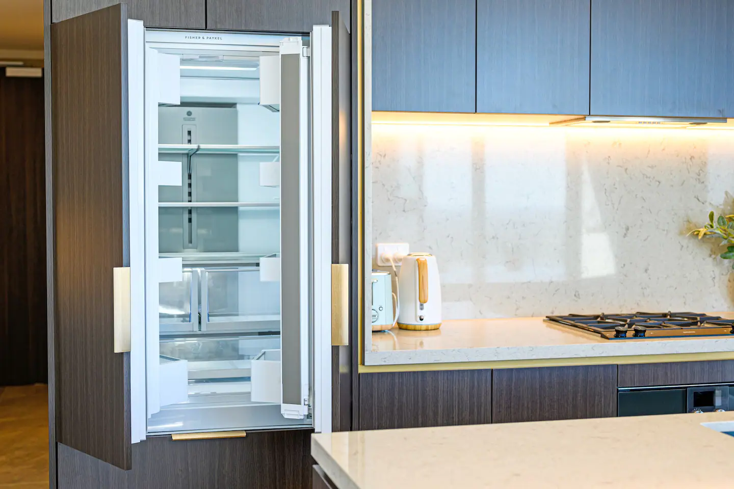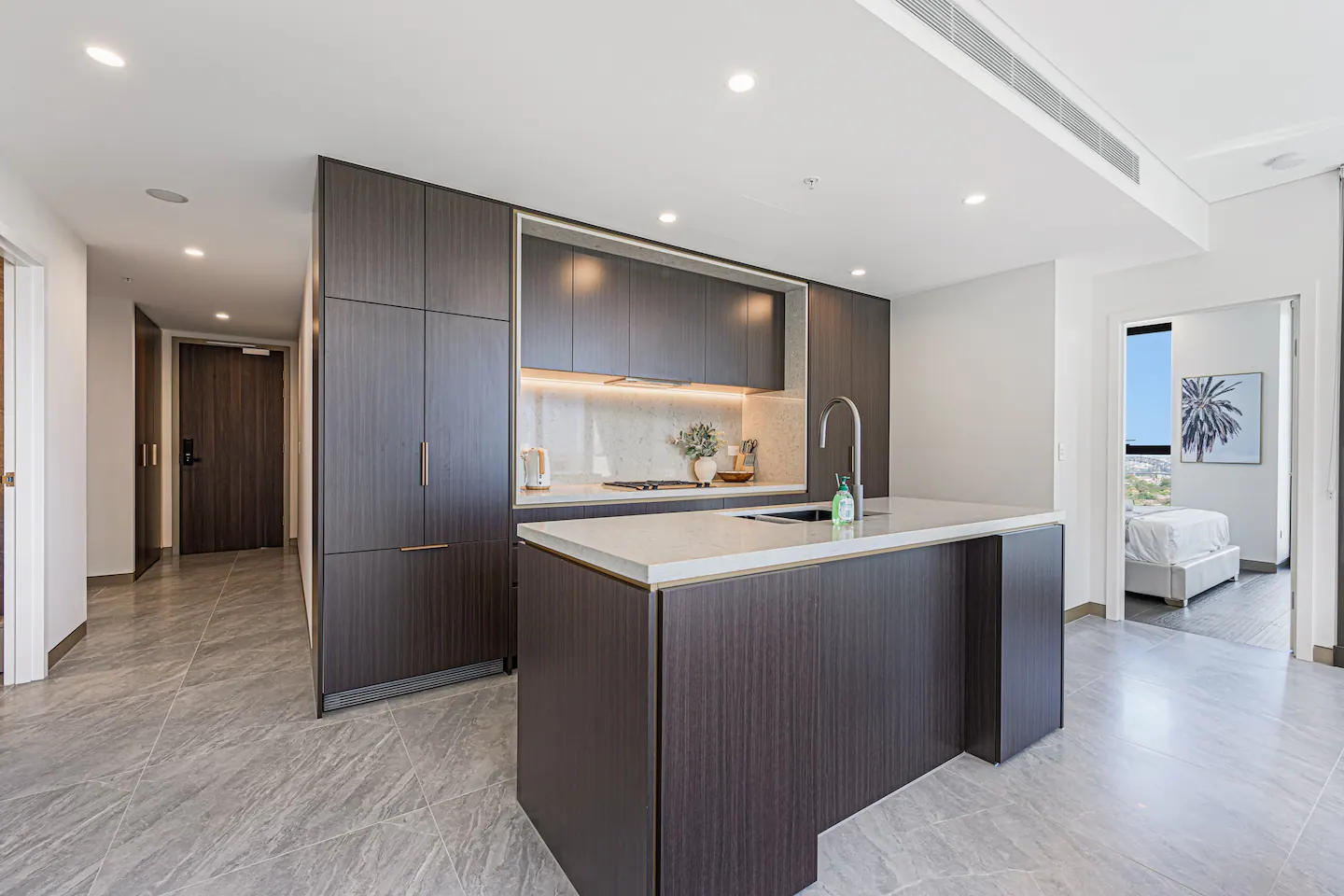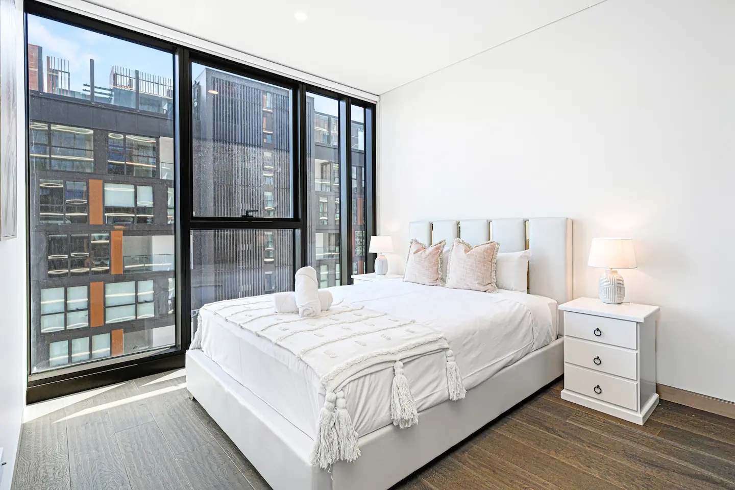 The apartment features floor-to-ceiling windows and large balcony that offer breathtaking views of the city skyline and Sydney Harbour Bridge. The living room is cozy and comfortable, with a flat-screen TV and a comfortable sofa. The kitchen is fully equipped with modern appliances and cookware, perfect for preparing meals at home.